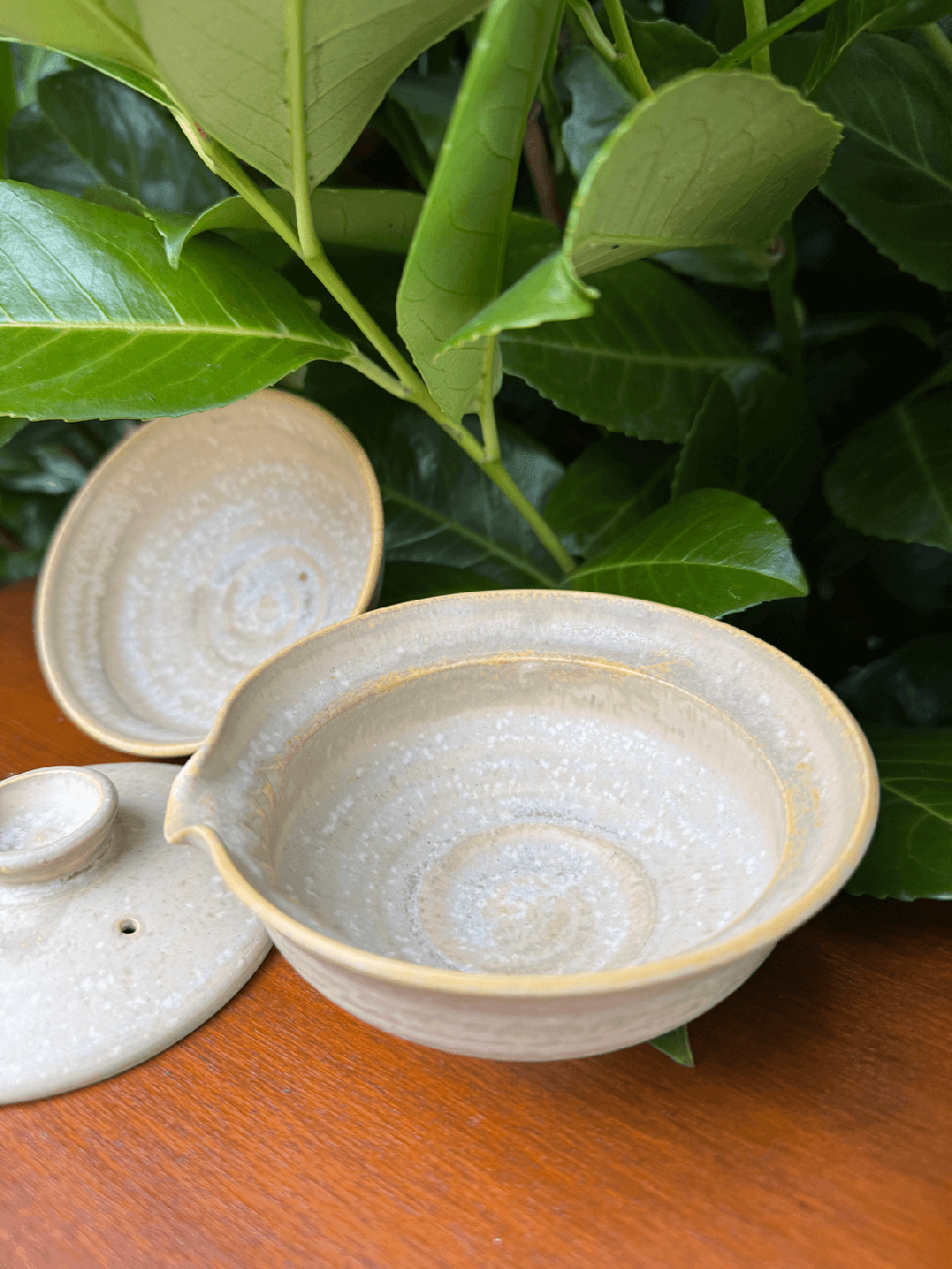 Tento krásný glazovaný gaiwan (zhong) s miskou je vyrobený z porcelánu. Jde o ruční práci Petra Jurníčka, který se keramikou zabývá již přes 30 let. Vypáleno v elektrické peci. Je vhodný spíše pro přípravu celolistových čajů či čajů s většími úlomky lístků.